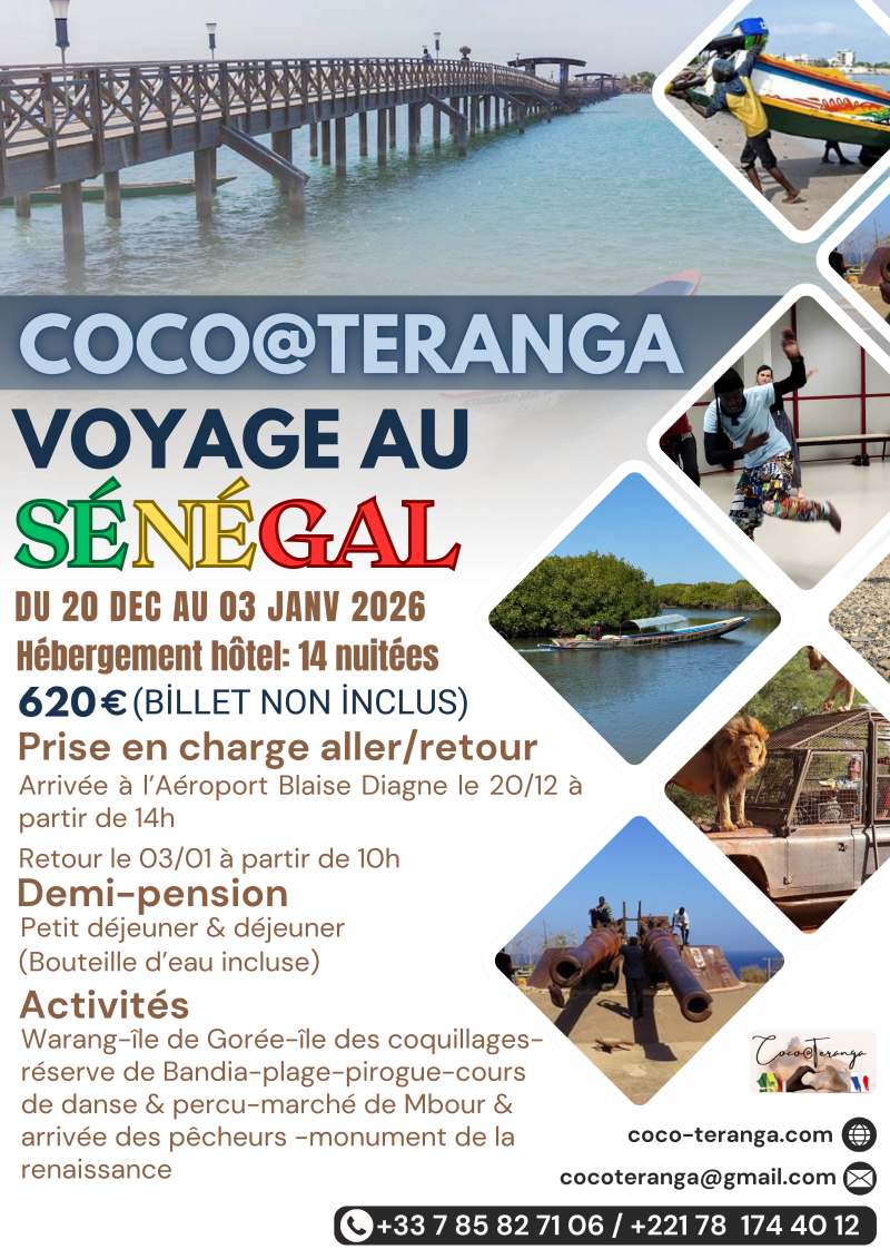 Nous sommes ravis de vous annoncer nos prochains événements qui mettront en lumière la culture et la danse africaine. Avec notre premier groupe du 06 au 20 Décembre 2025 ensuite avec notre deuxième groupe qui sera du20 Décembre 2025 au 03 Janvier 2026, plongez dans l'univers envoûtant du Sénégal à travers nos ateliers de danse, workshops de percussions, rencontres inspirantes, animations vivantes et notre festival explosif.